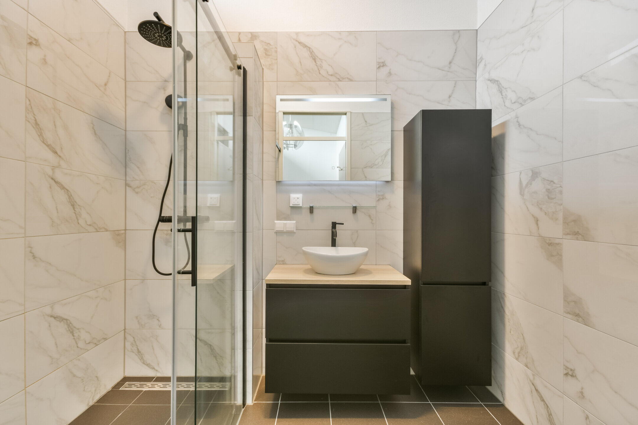 Via de trap in de hal, bereiken we de overloop van de eerste verdieping met 2 (voormalig 3) royale slaapkamers, de wasruimte met Cv-installatie en de moderne badkamer met wastafelmeubel en ruime inloopdouche.